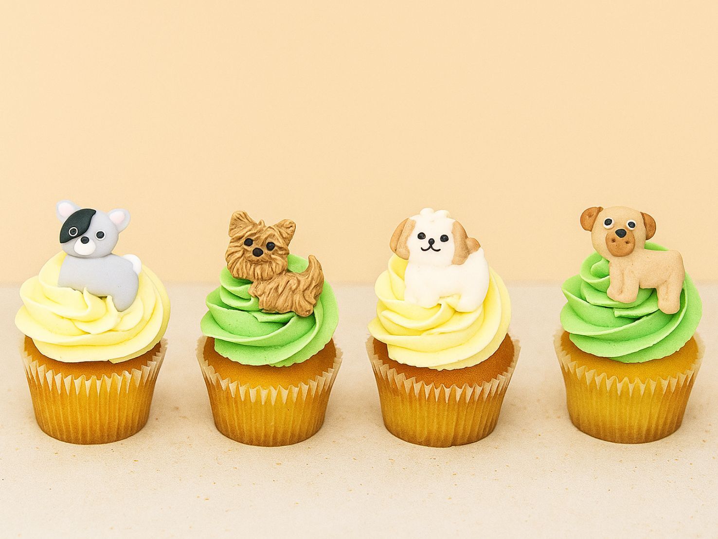 Available in a box of four cupcakes. Our Chicken and Liver Cake cupcakes, feature a mix of vibrant blue and sunny yellow frosting, decorated with frosting and sprinkles. It is crowned with a choice of yogurt or peanut butter topping—plus a biscuit bone garnish for an extra dash of love.